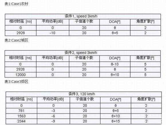 1)多天線解調(diào)測試(靜態(tài)測試):在不同的來波角度(DOA)下測試接收性能。各條徑存在一定的角度擴(kuò)展,各條徑分別來自不同的角度。驗(yàn)證在該傳播環(huán)境下接收機(jī)的解調(diào)性能。傳播環(huán)境如表1-表3所示。